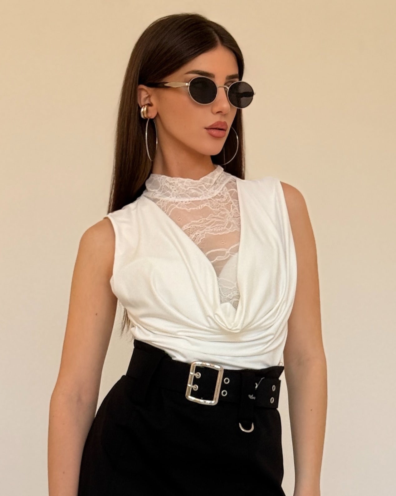 Body in pizzo con effetto blusa sul davanti, elasticizzato con chiusura bottoni sul retro