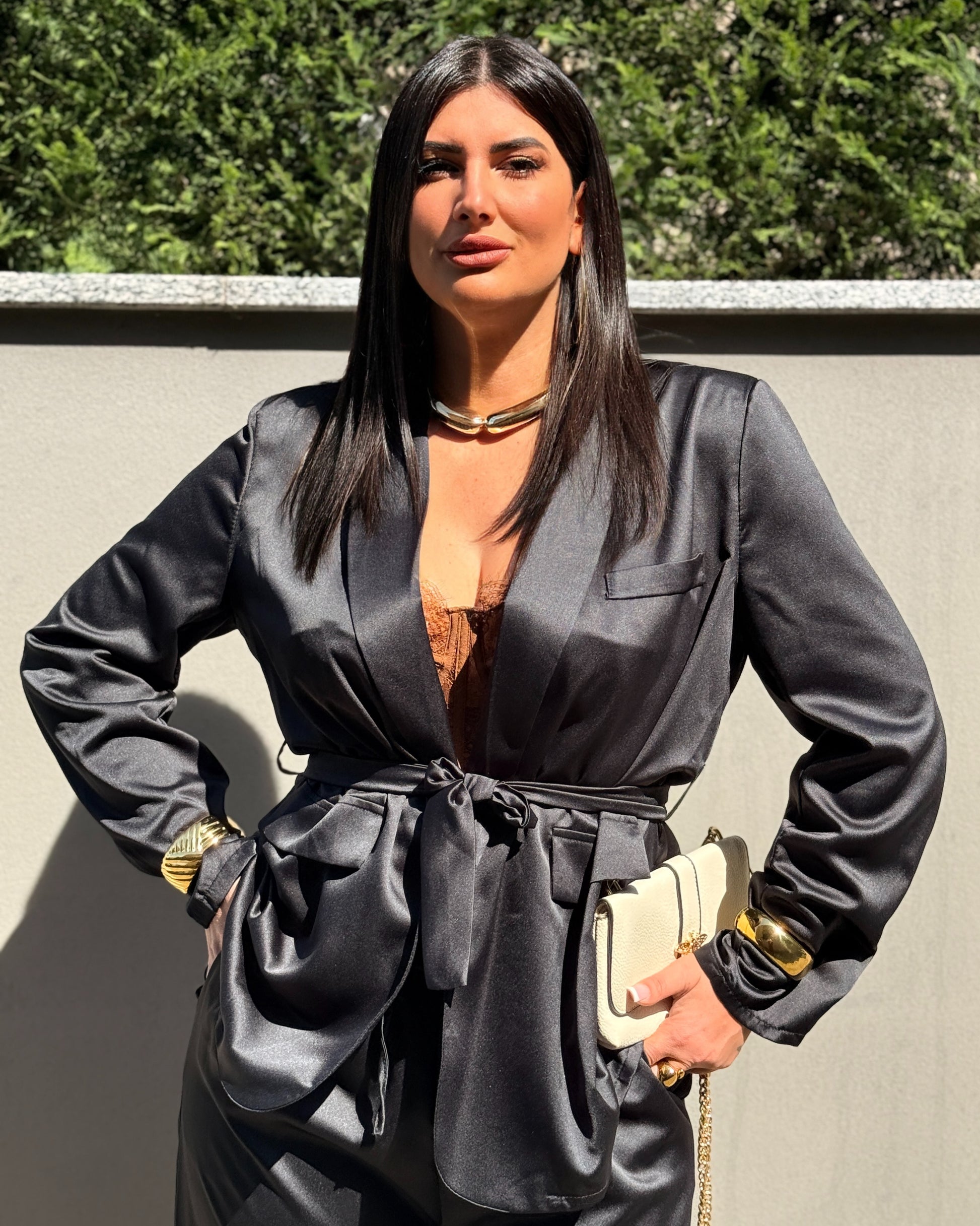 Completo in simil seta composto da blazer con cintura e pantalone a palazzo con elastico in vita