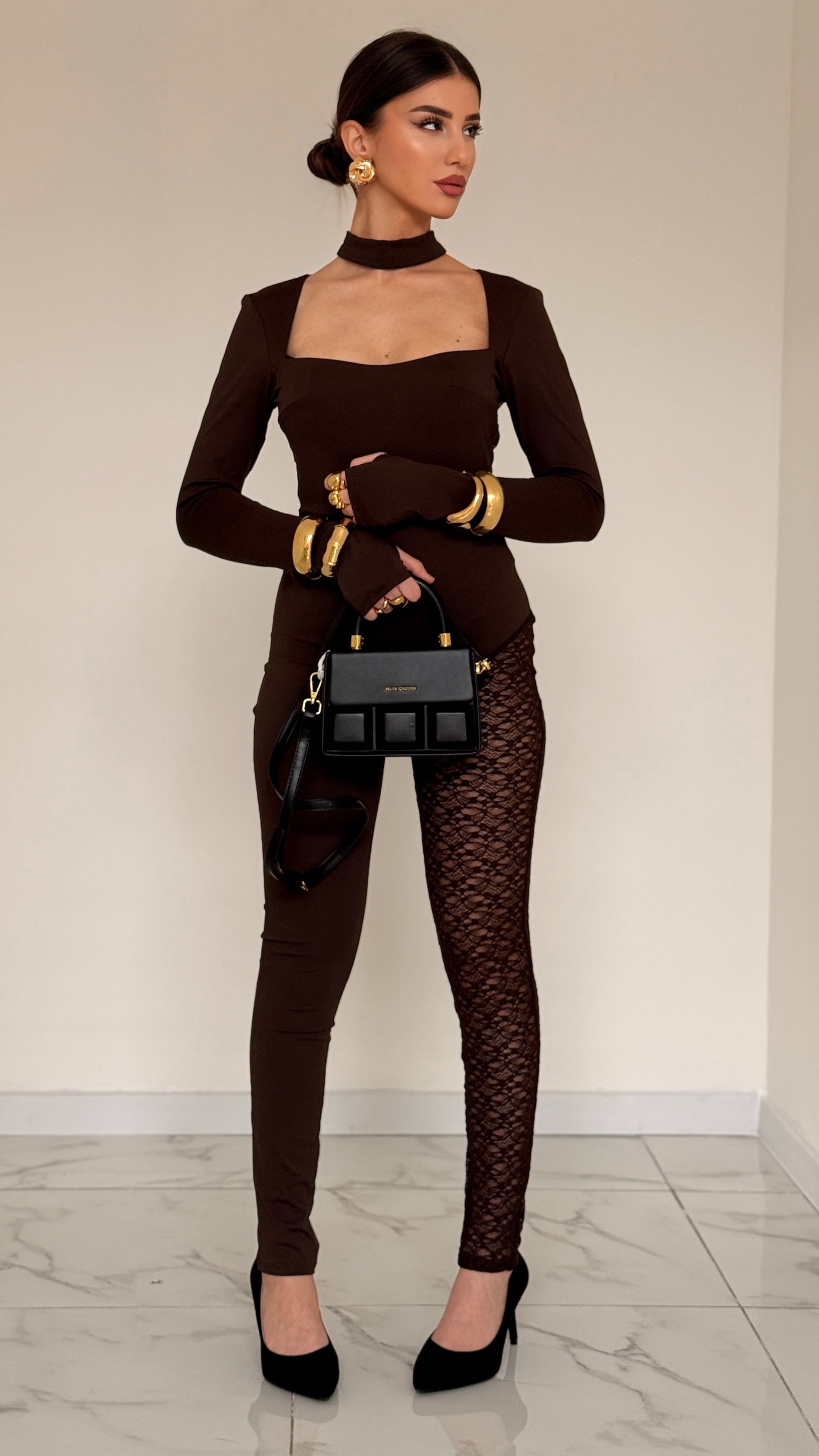 Tuta intera con una gamba il total pizzo e choker in tessuto